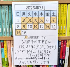 営業日のお知らせ すべて 営業日 商品 その他 2026年2月26日(木) 営業日 【3月前半営業日のお知らせ】 お世話になっております。 3月前半営業日のお知らせです。 営業日は画像の通りです。 ※14日(土)は 11〜18時半までの営業です。 ご注意ください。 よろしくお願いします。 #みのたけ書店 #東大阪 #河内小阪 #古本屋 #レコード屋 投稿ナビゲーション 前へ